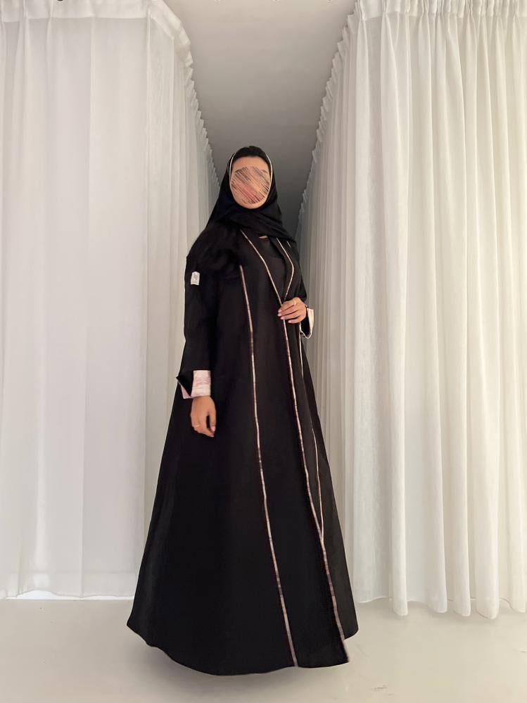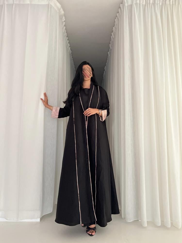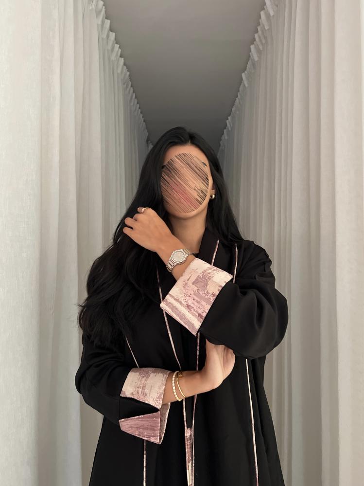 التفاصيل : قماش كتان " ميني مات " اسود مع قيطان تحديد قماش جاكار تركي لون وردي من الامام والخلف ، الكم جاكار تركي وردي ، قصة العباية رسمية وربع كلوش .مدة تنفيذ الطلب من 7-14 يوم عمل.يمكن تغيير القصة على حسب الطلب.