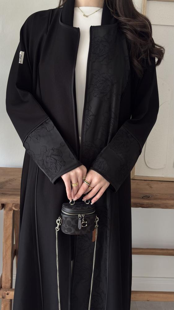 التفاصيل : قماش كتان " ميني مات " اسود ، مع تدخيلة قماش جاكار اسود مشجر ، قصة العباية ربع كلوش ..مدة تنفيذ الطلب من 7-14 يوم عمل.يمكن تغيير القصة على حسب الطلب.